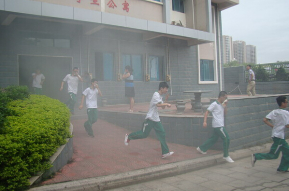 一點四十五分,警報響起,在學校德育處、各年段長和班主任的組織下,學生們捂著事先準備好的濕毛巾,一個接一個地從學校宿舍樓向操場迅速撤離。一點五十分,警報解除。全體學生安全撤離到學校后操場。