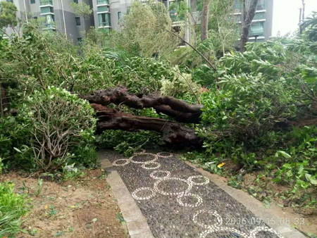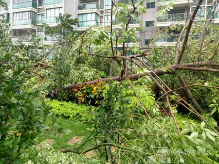 2016年9月15日凌晨3點(diǎn)05分左右,最強(qiáng)臺(tái)風(fēng)“莫蘭蒂”登陸廈門翔安,給廈門、泉州等市造成了巨大的損失,三遠(yuǎn)·廈門加州海岸小區(qū)亦深受影響,小區(qū)綠化樹木、路燈、電梯、智能系統(tǒng)、共用部位采光鋁合金窗及玻璃等公共設(shè)施設(shè)備損壞嚴(yán)重。面臨最強(qiáng)臺(tái)風(fēng)帶來的危險(xiǎn)及破壞力,三遠(yuǎn)人始終和業(yè)主在一起。
