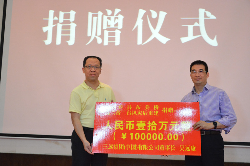 511日,泉州市僑商會一屆四次會議在永春北溪召開,三遠集團董事長、泉州市僑商會執行會長吳遠康及泉州市各縣(市)區僑聯領導等70余人出席。在當日會議舉行的捐贈儀式上,吳遠康先生捐贈人民幣10萬元用以支持在“莫蘭蒂”臺風中損壞的永春東關橋災后重建工作。