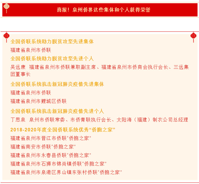 2月3日,中國僑聯十屆四次全委會議召開,會議通報表彰一批先進集體和先進個人,以及全國僑聯系統優秀“僑胞之家”。泉州市僑聯榮獲“全國僑聯系統助力脫貧攻堅先進集體”和“全國僑聯系統抗擊新冠肺炎疫情先進集體”,有2名先進個人,并有5個僑聯組織榮獲全國僑聯系統優秀“僑胞之家”。泉州市僑聯兼職副主席、泉州市僑商會執行會長、三遠集團(中國)有限公司董事長吳遠康先生榮獲全國僑聯系統助力脫貧攻堅先進個人稱號。